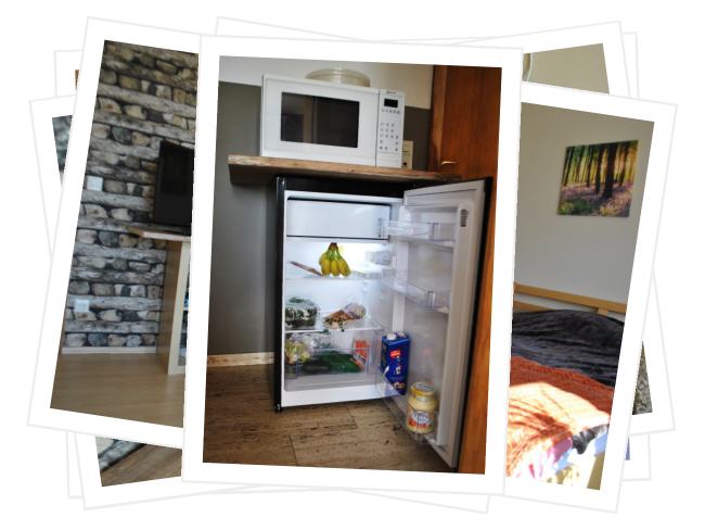 Vor dem Zimmer steht der separate Kühlschrank für unsere Gäste sowie eine Microwelle.