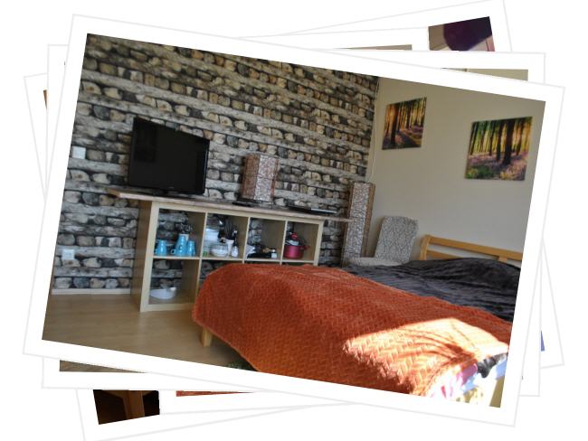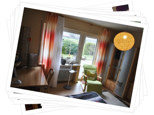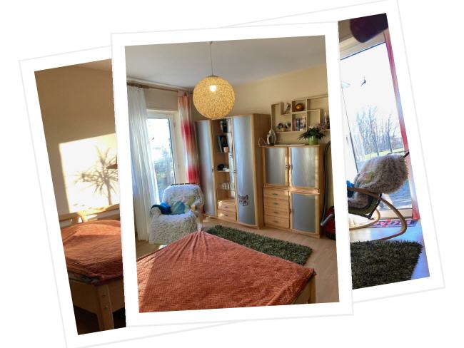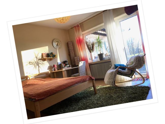 Doppelzimmer (Bettgröße 140 x 200cm) Das Zimmer hat eine eigene Tür zur Terrasse. Die Lage zur Südseite beschert Sonne den ganzen Tag. Wir wohnen ländlich mitten im Grünen - ohne Lärm und Smog!