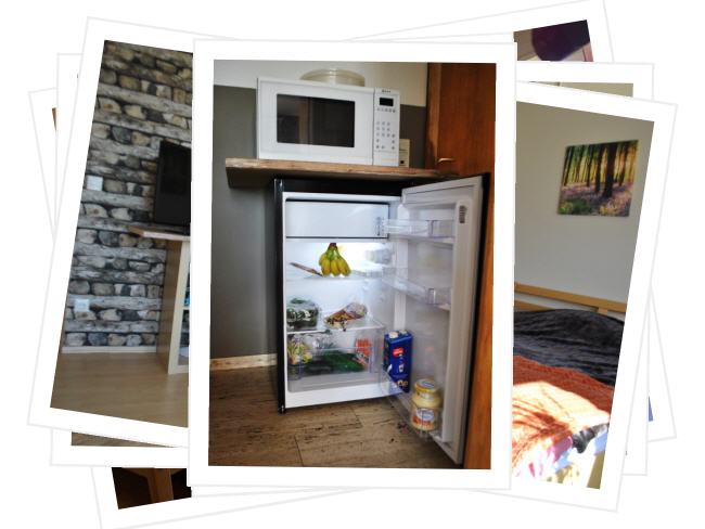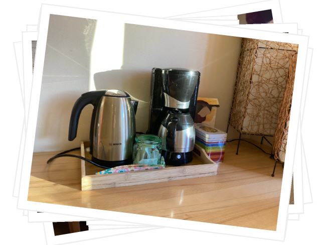 - ein Arbeitsplatz/Tisch - Kaffeemaschine und Kaffepulver - Induktionskochplatte - Kochtöpfe (keine Pfannen!) - Teller, Tassen, Besteck - Wasserkocher - Handtücher - Bettwäsche - TV 100 x 70 cm