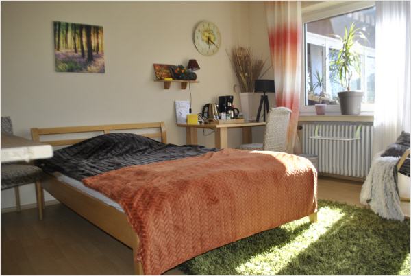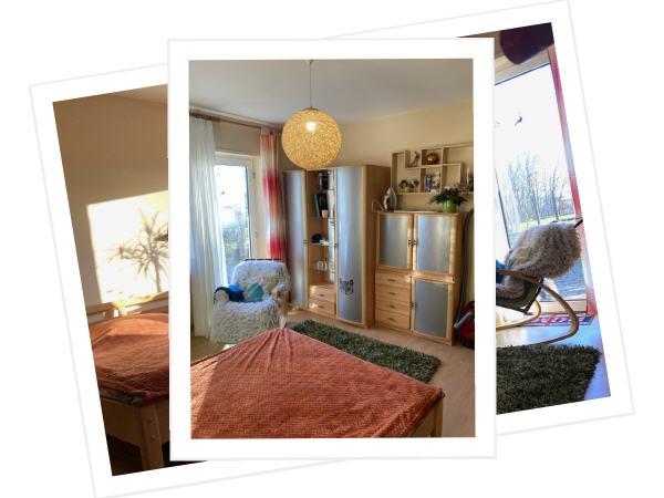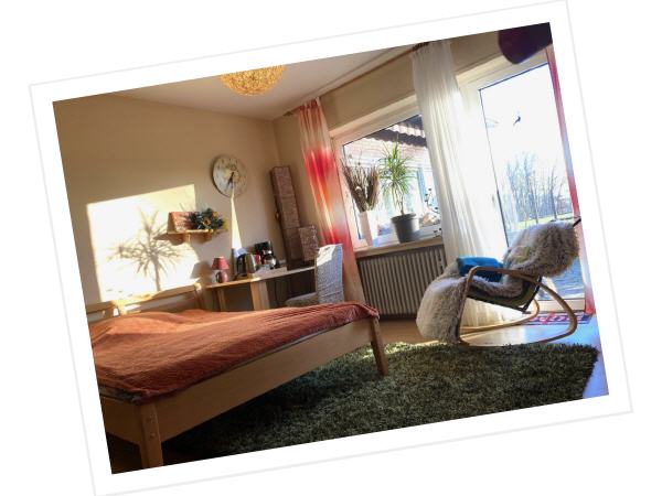 Das große Zimmer hat Platz für ein bis zwei Personen. Es ist sonnig zur Südseite gelegen und hat eine eigene Terassentür was bequem ist für Raucher.