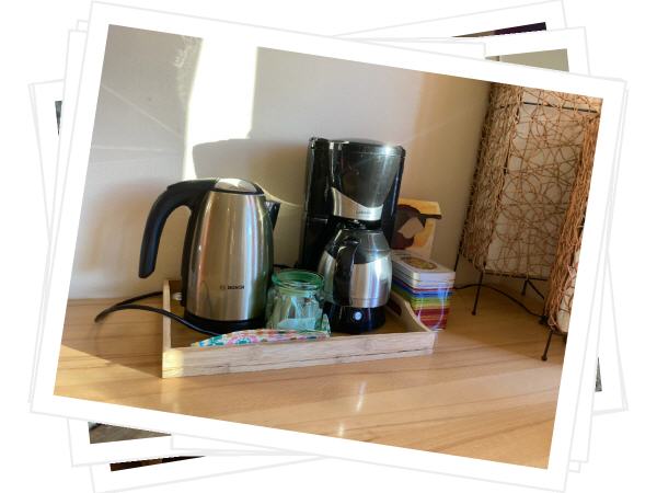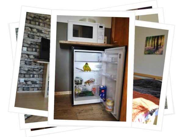 Vor dem Zimmer steht der separate Kühlschrank für unsere Gäste sowie eine Microwelle.